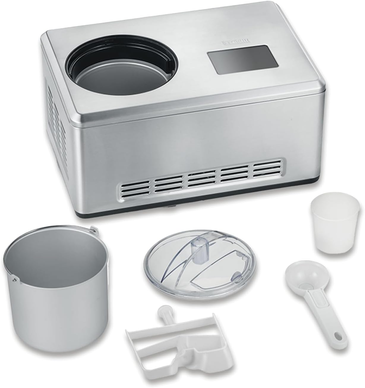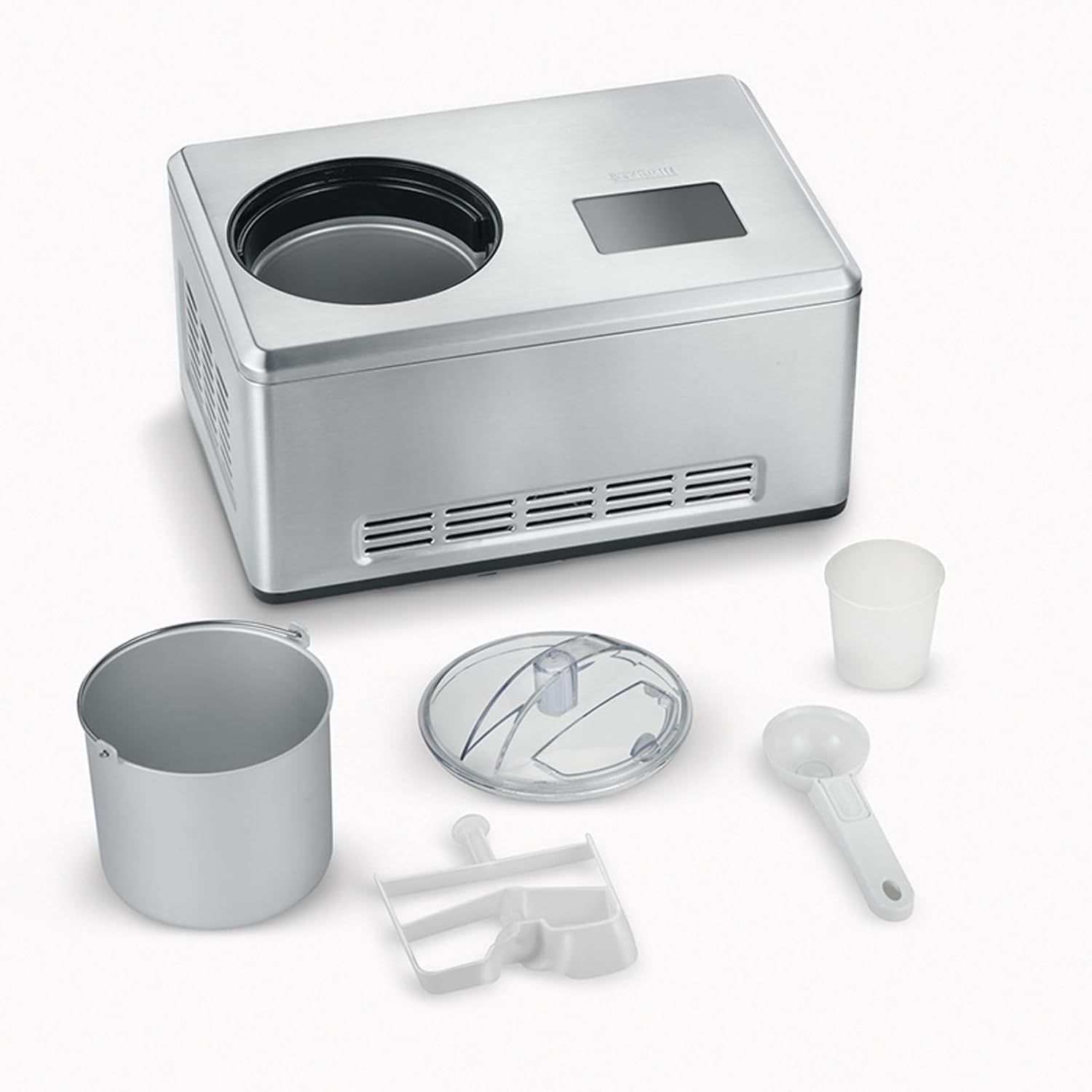 - Détails - Sorbetière SEVERIN avec compresseur, boîtier en acier inoxydable, 2 récipients de 2 L, cuillère à glace et gobelet doseur, Qualité Allemande, modèle n°. EZ 7406